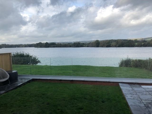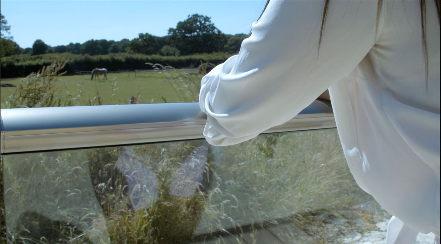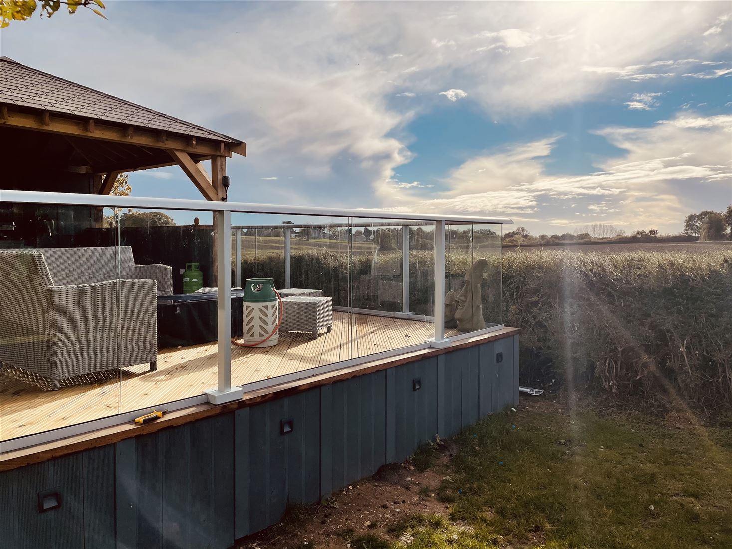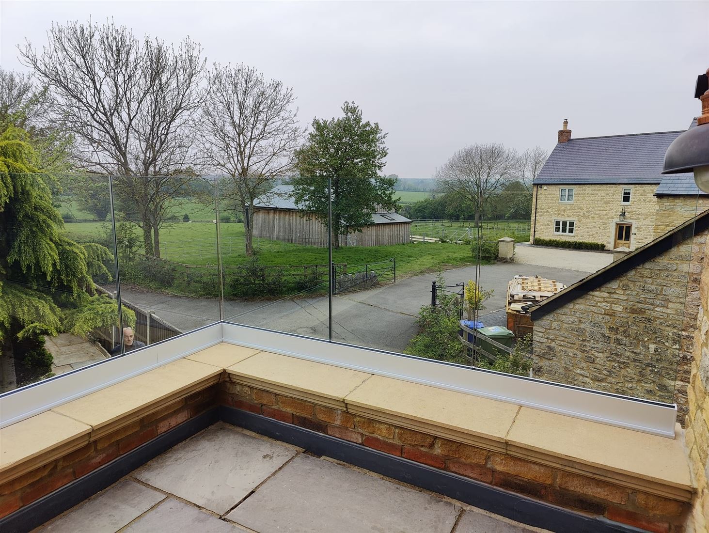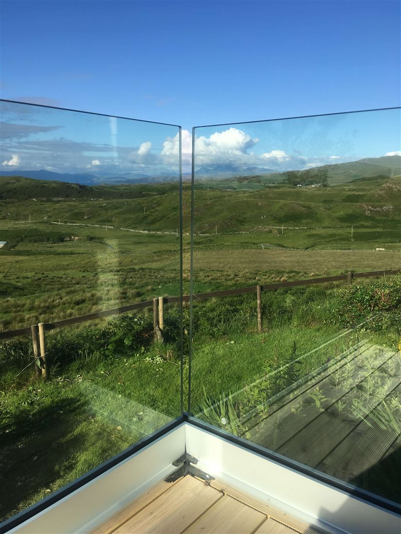 Corner countryside view through short clear glass balustrade with silver handrails and posts
