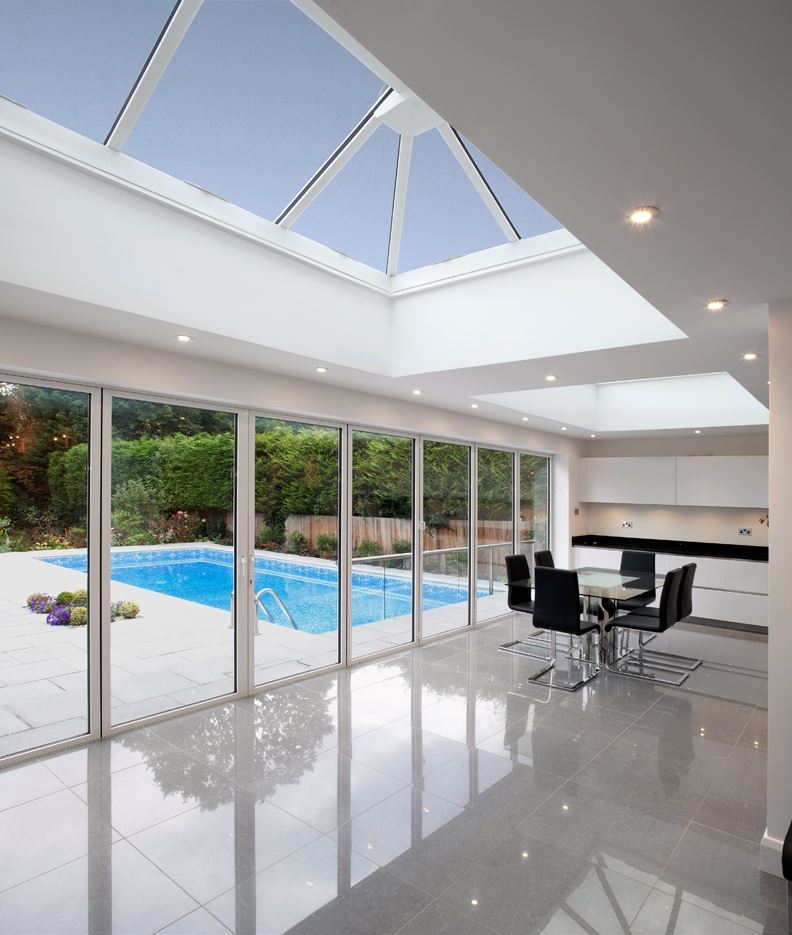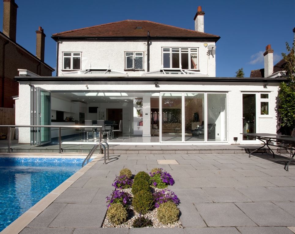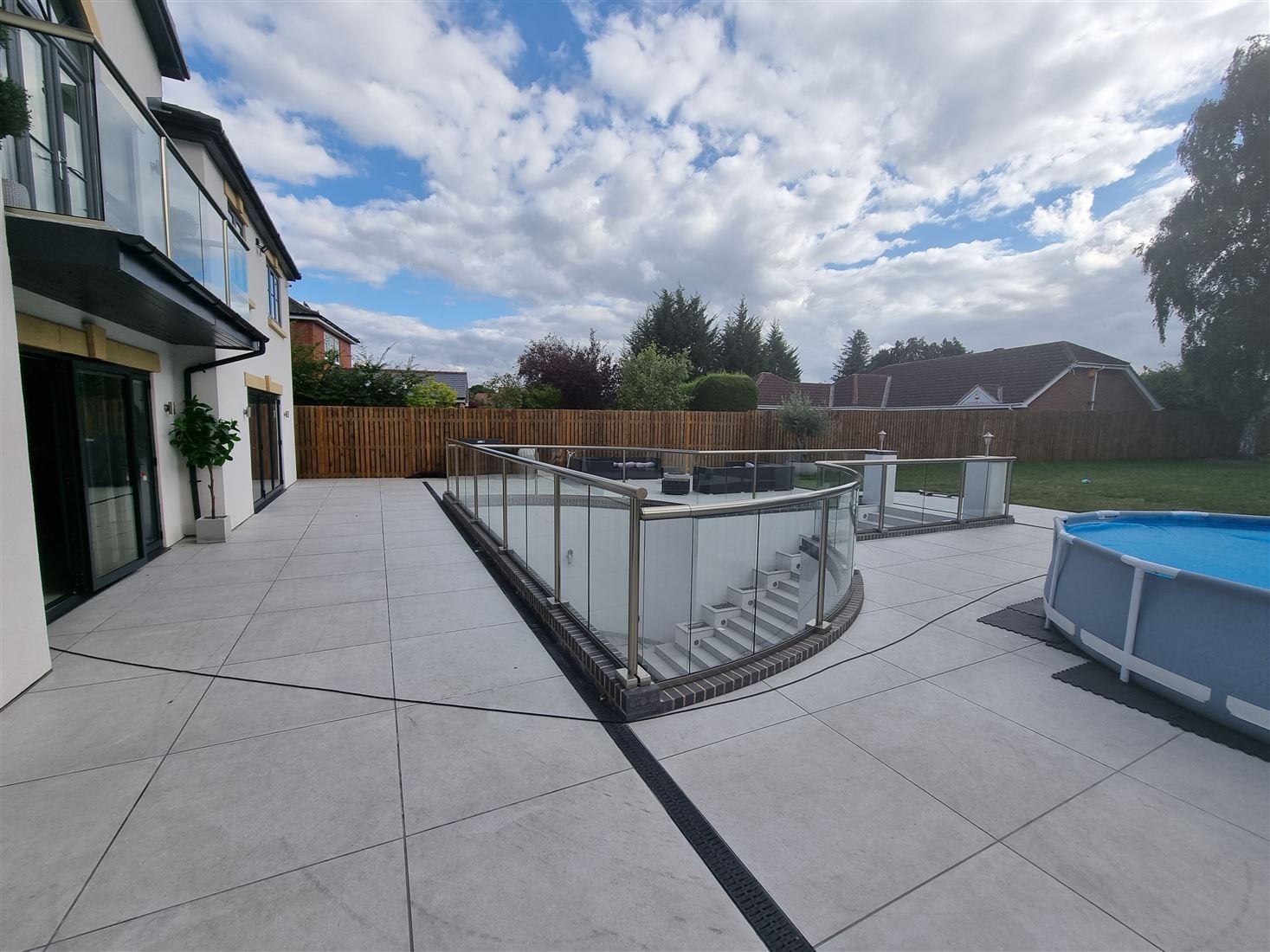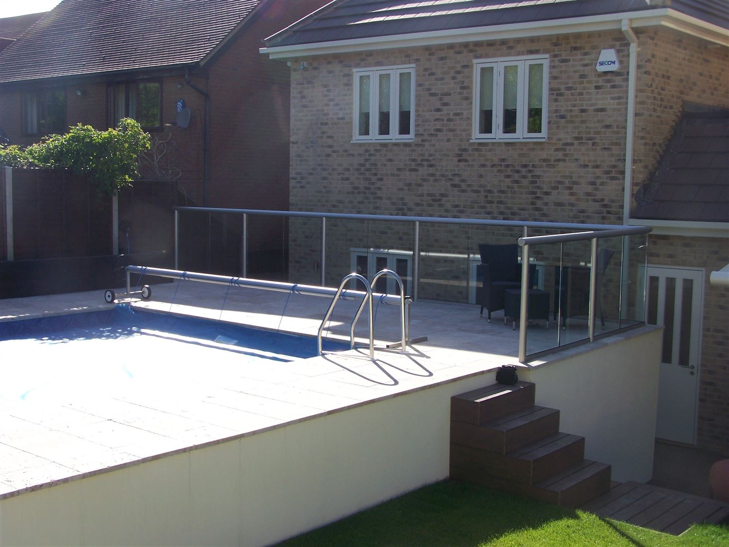 Long Royal Chrome balustrades over looking the blue swimming pool and garden