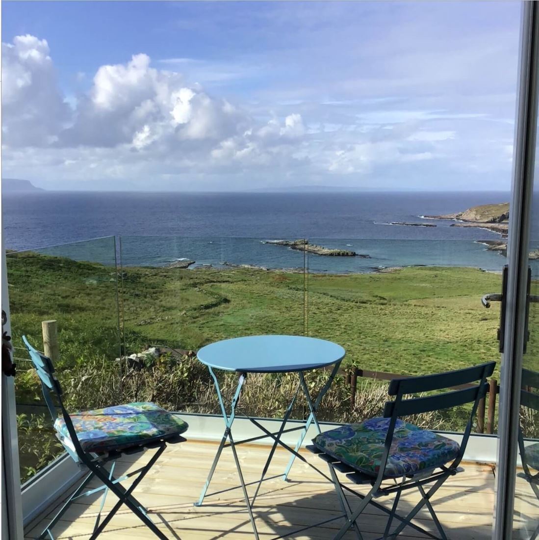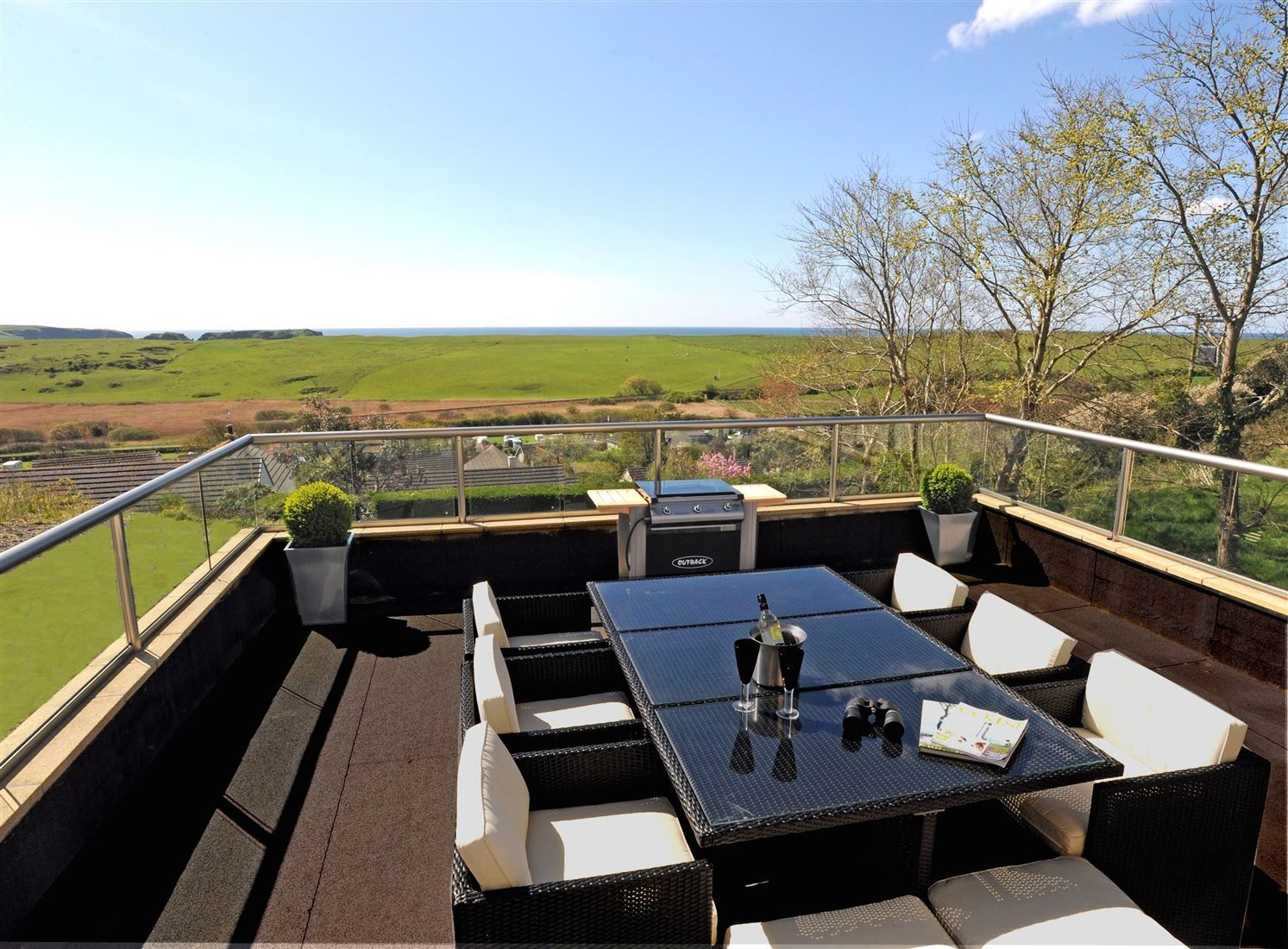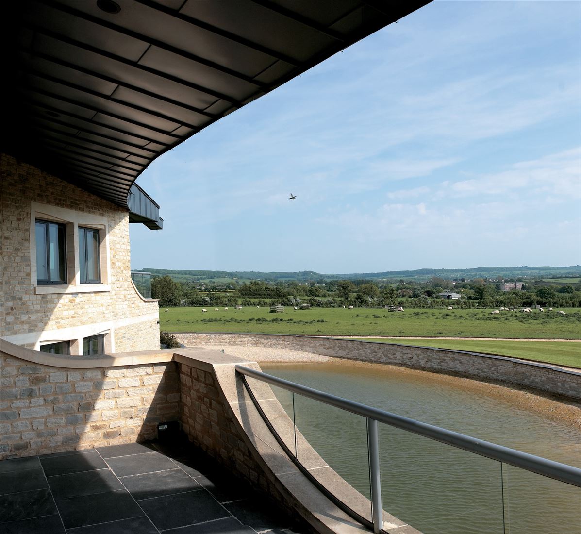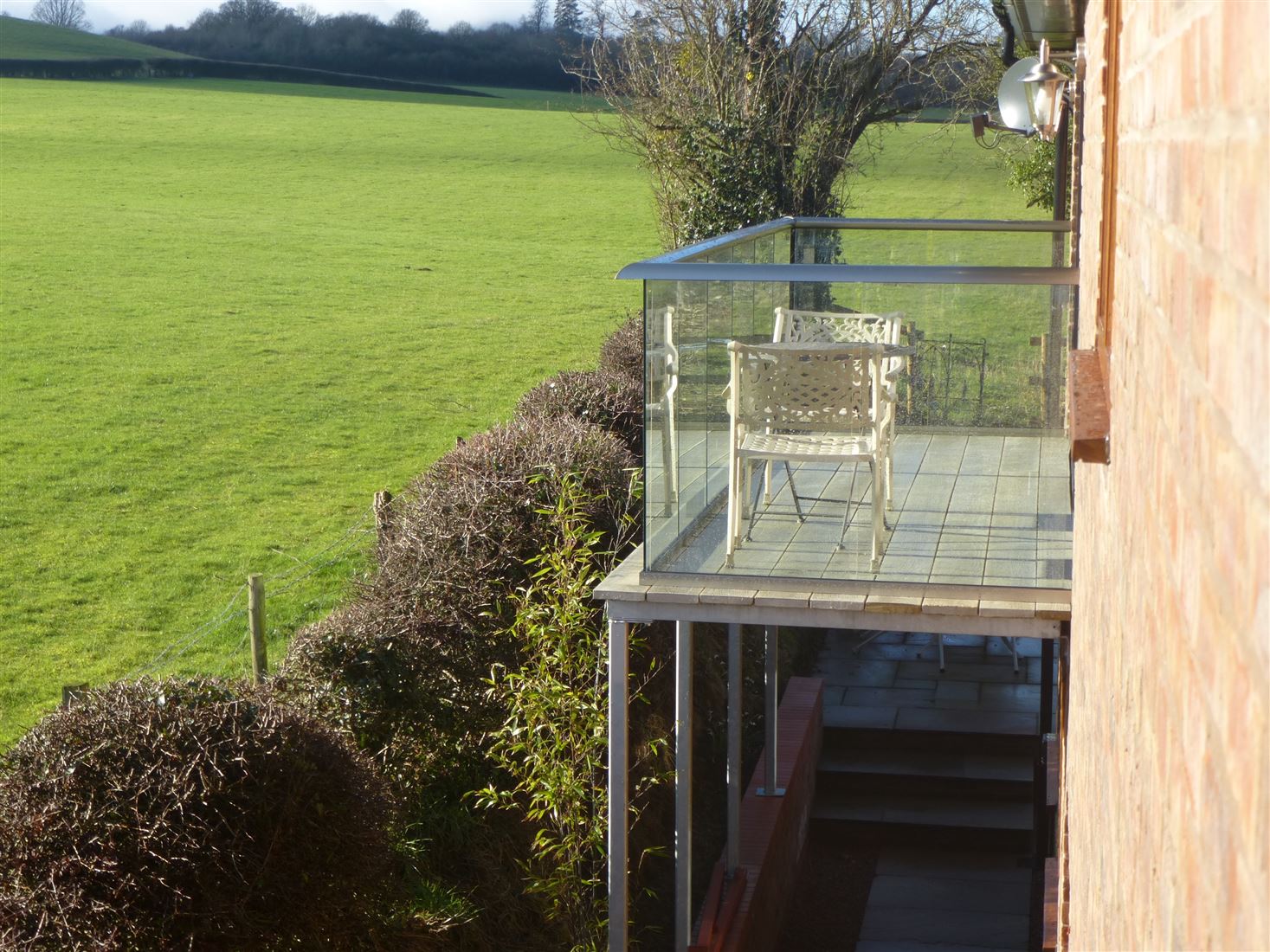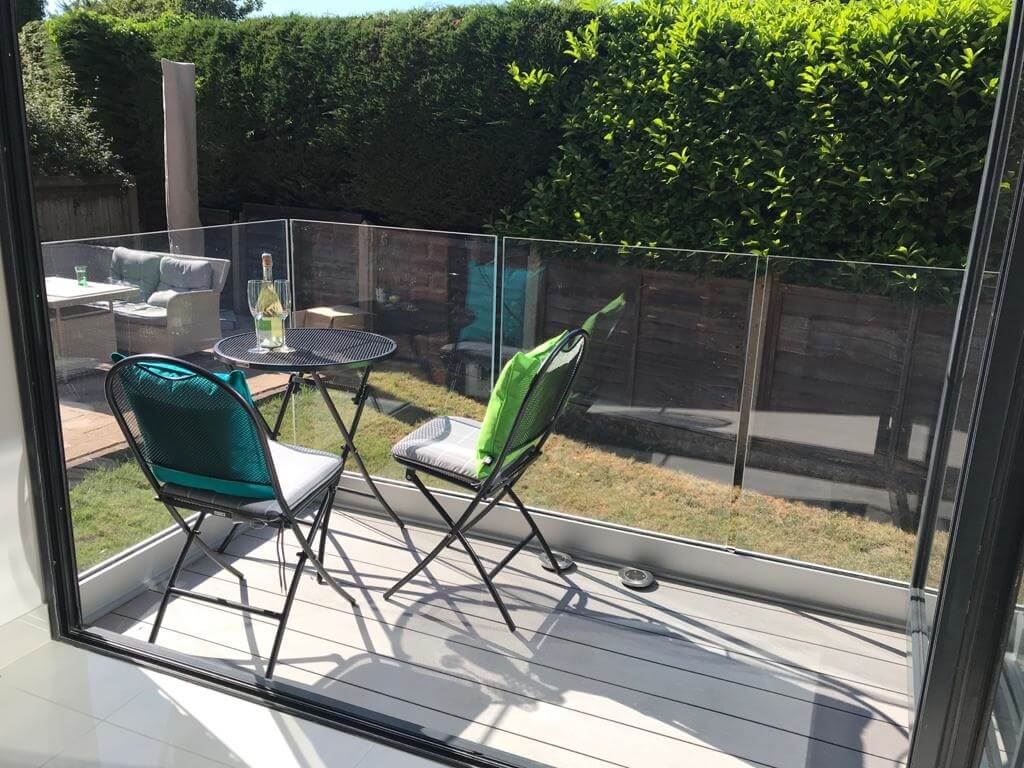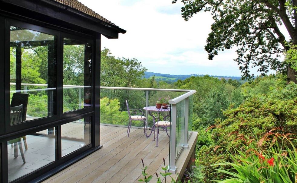 table and chairs set up on a Royal Chrome balustrade balcony with stunning countryside views
