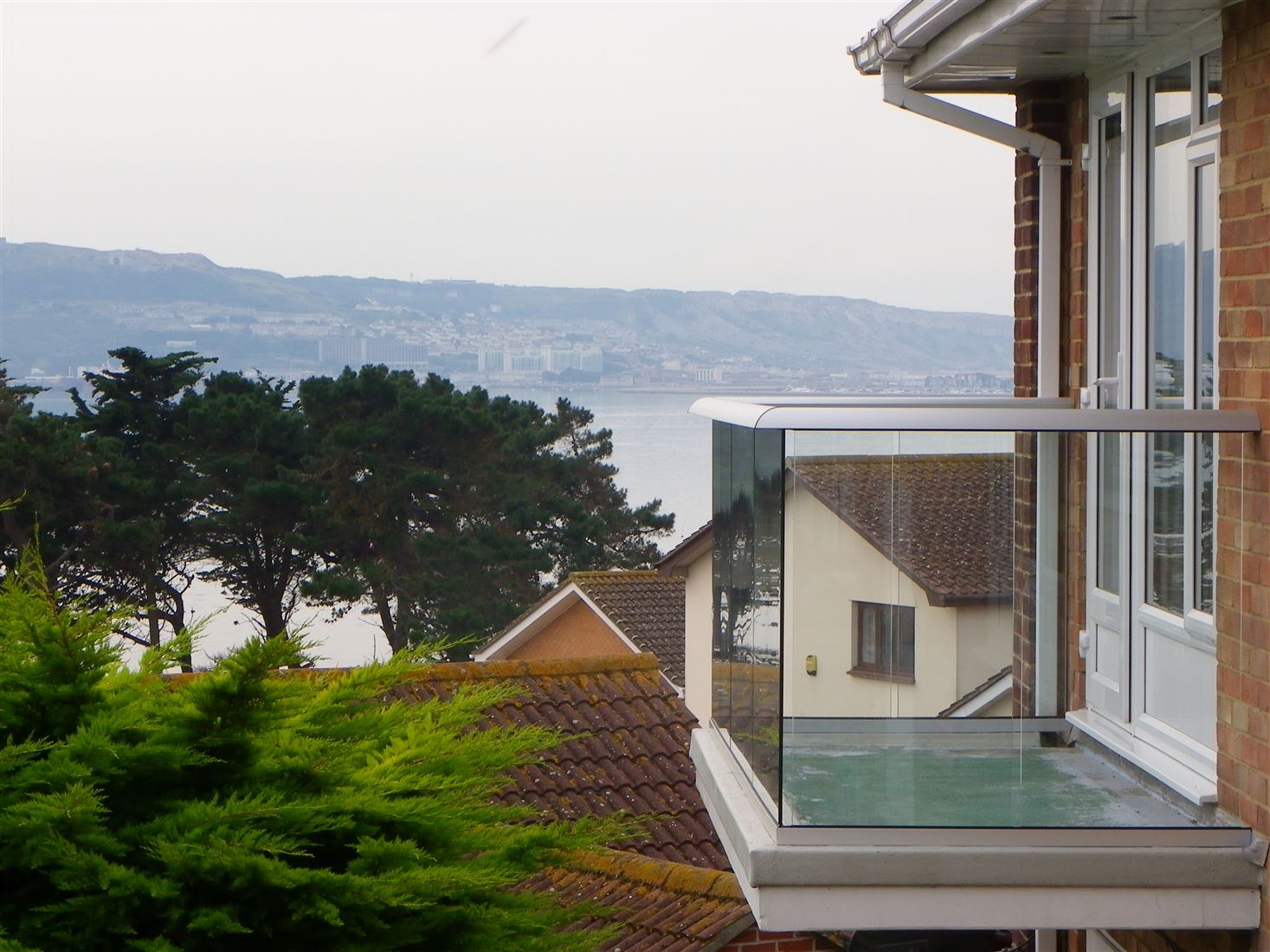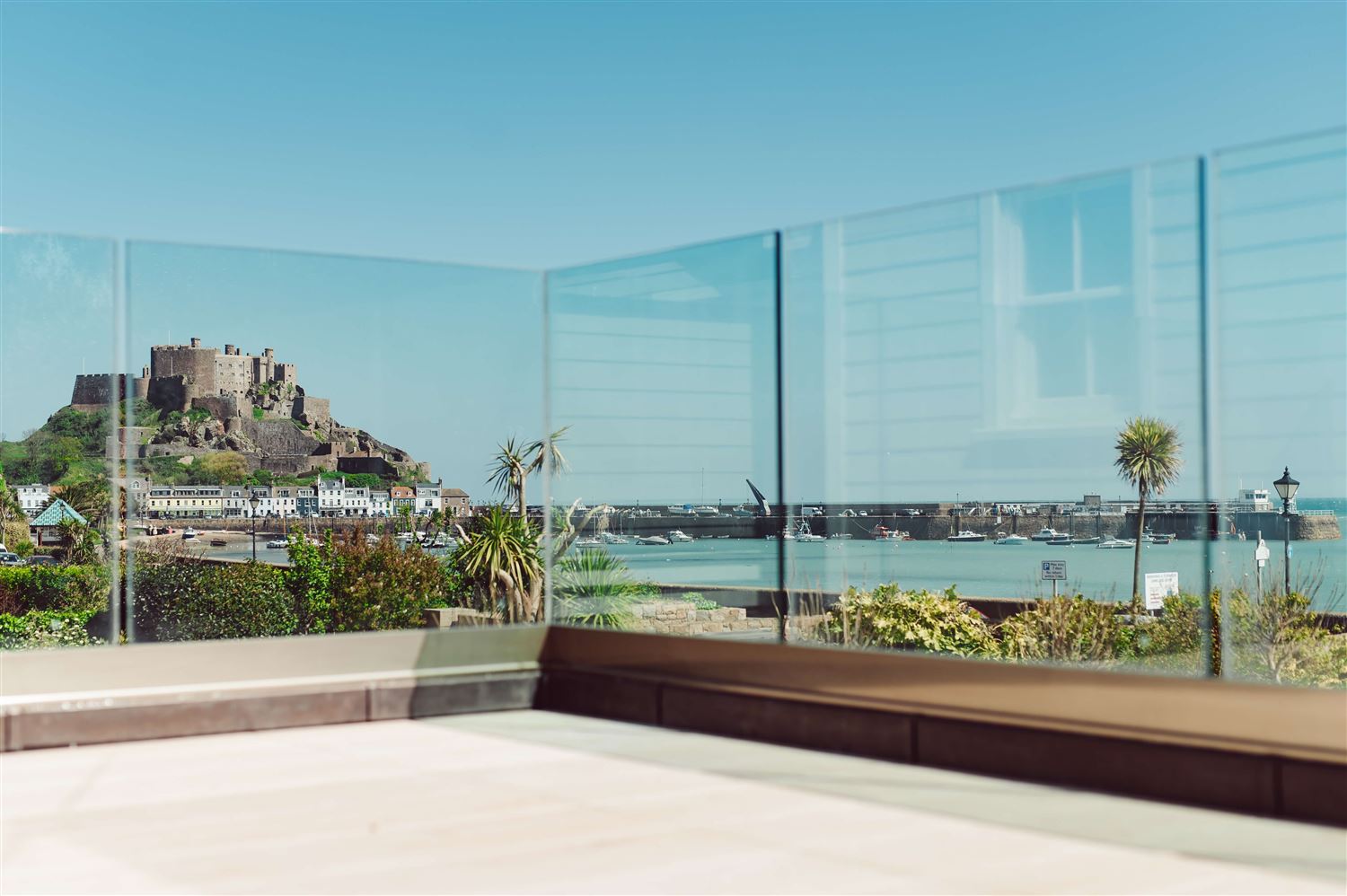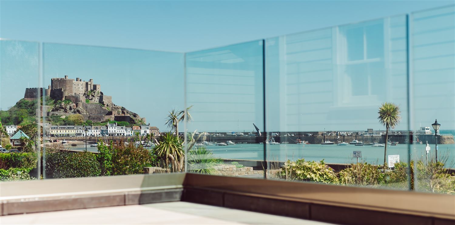 Looking out on to a balcony with silver handrails overlooking the harbour