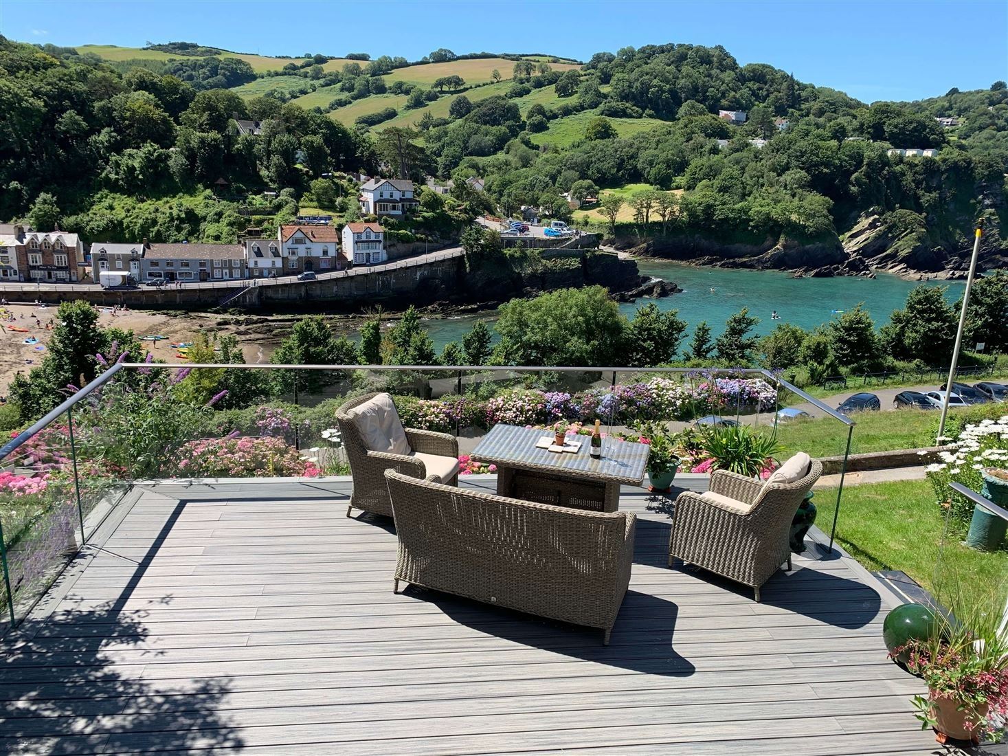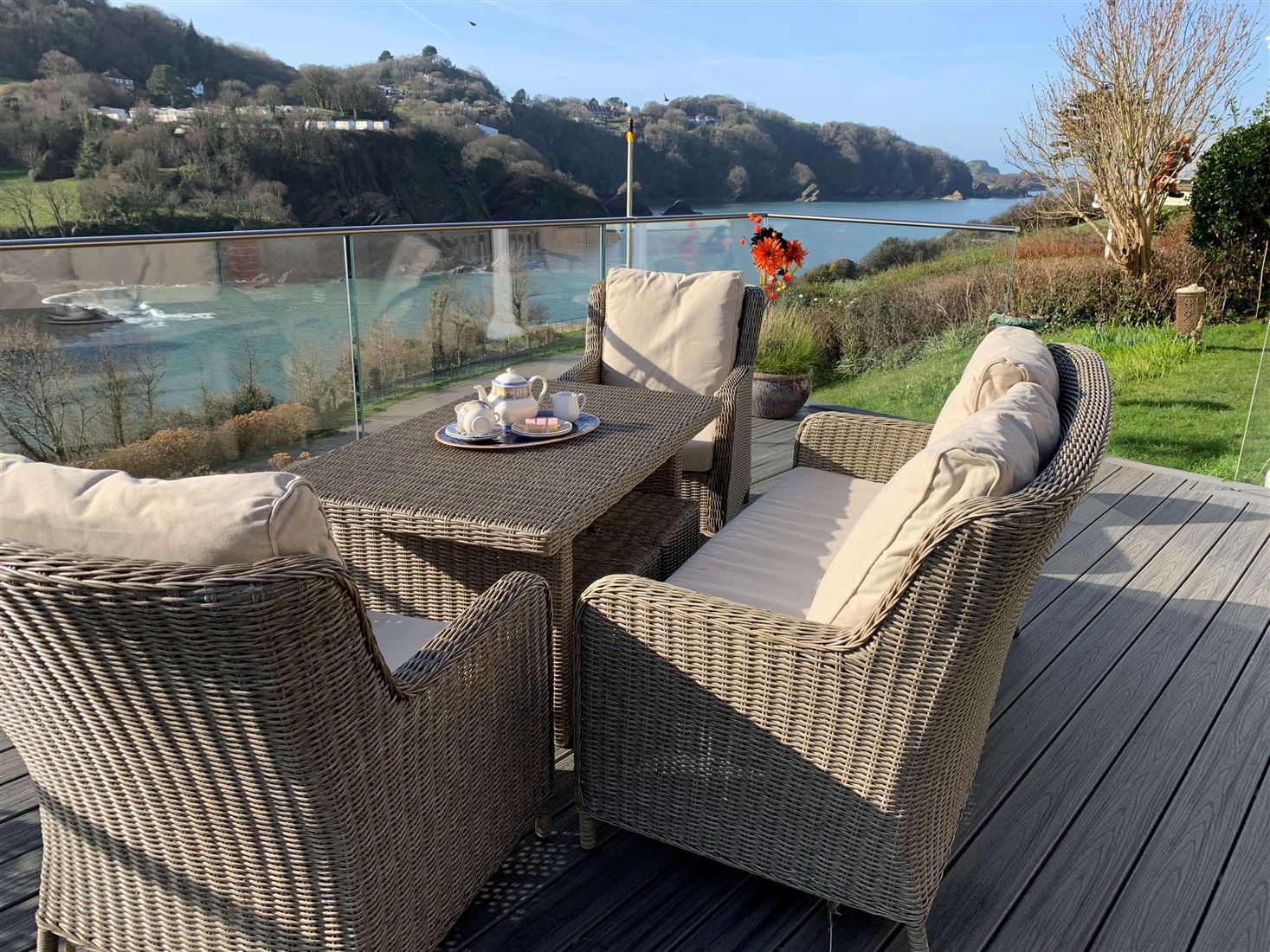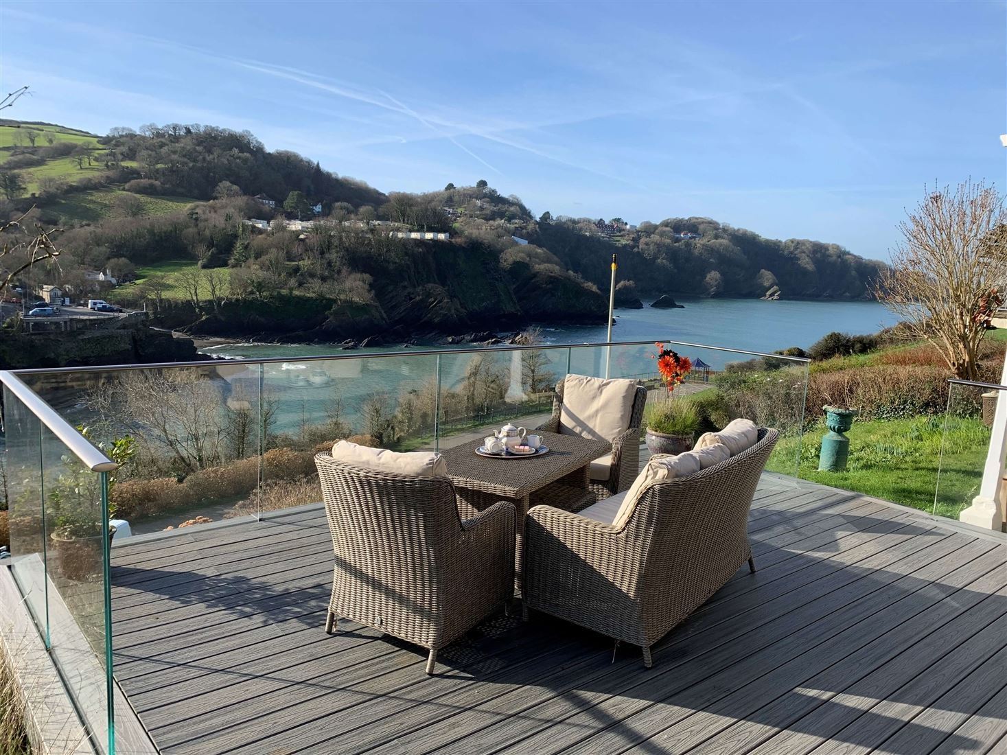 Looking out on to a balcony with silver handrails overlooking the harbour