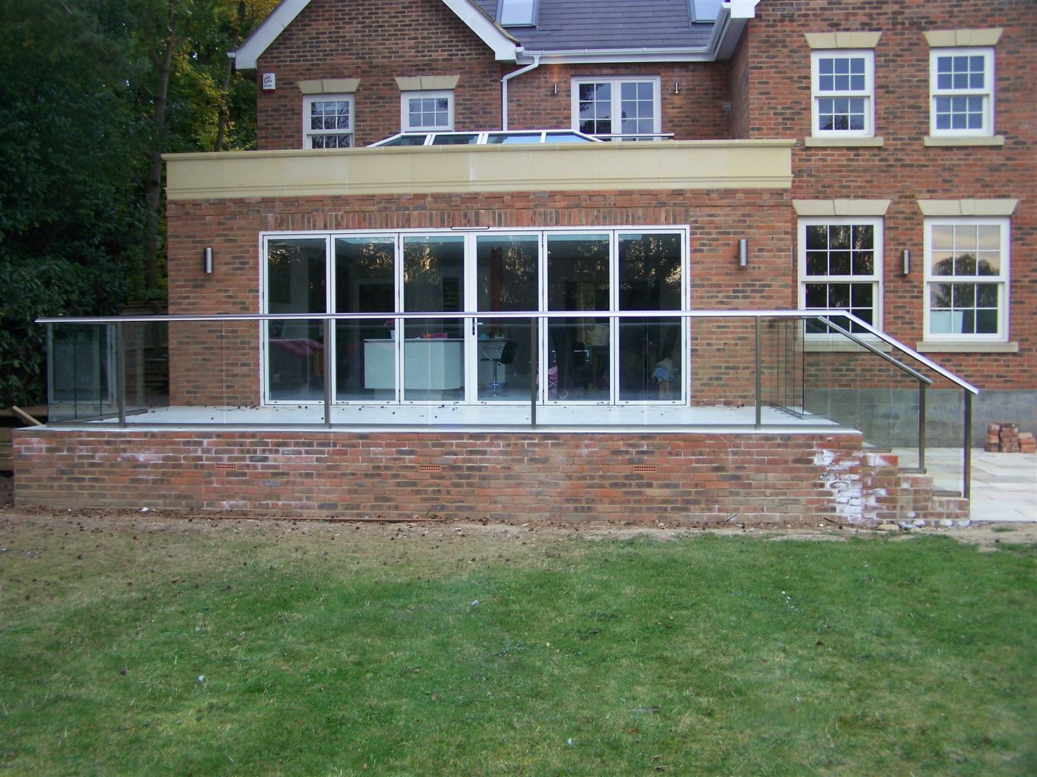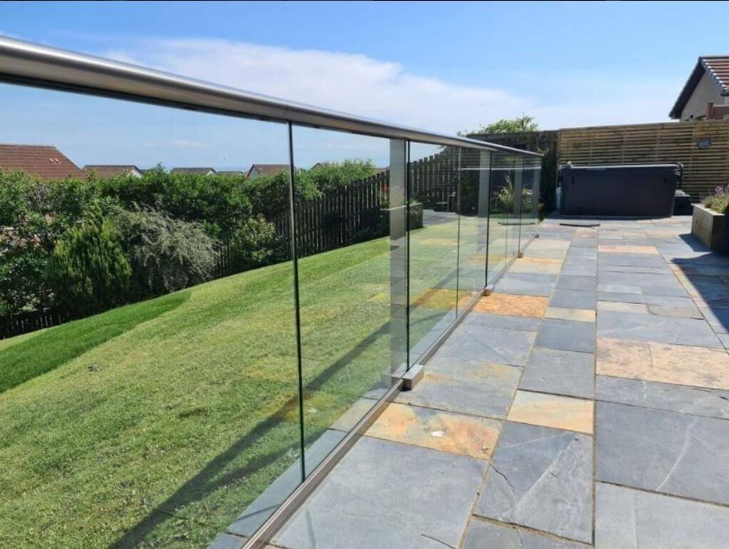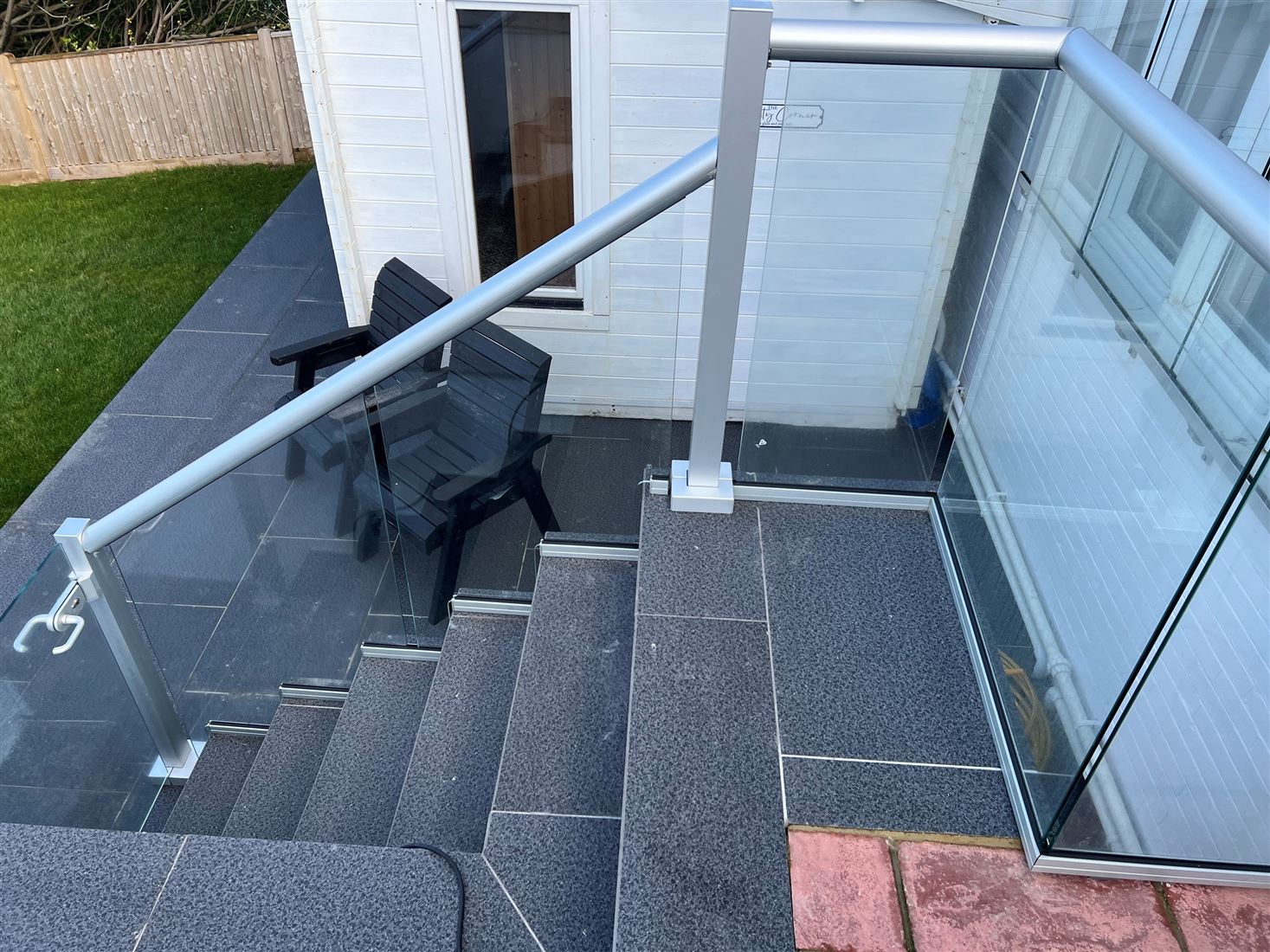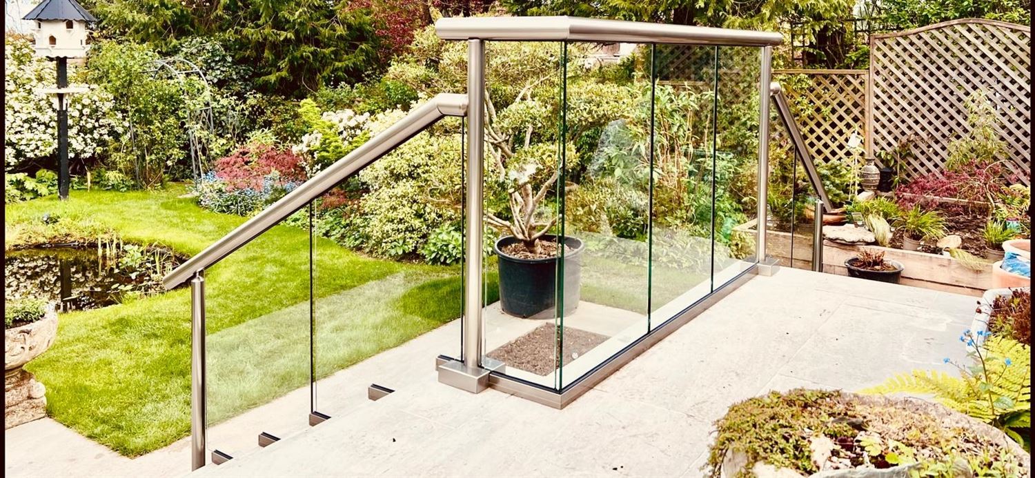 Long balustrade with clear glass and Royal Chrome handrails and posts