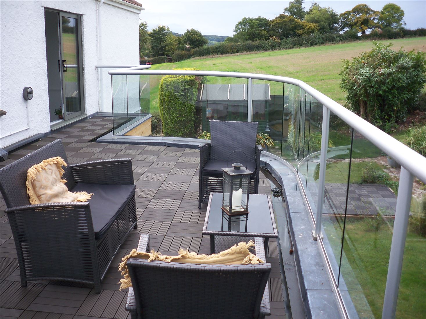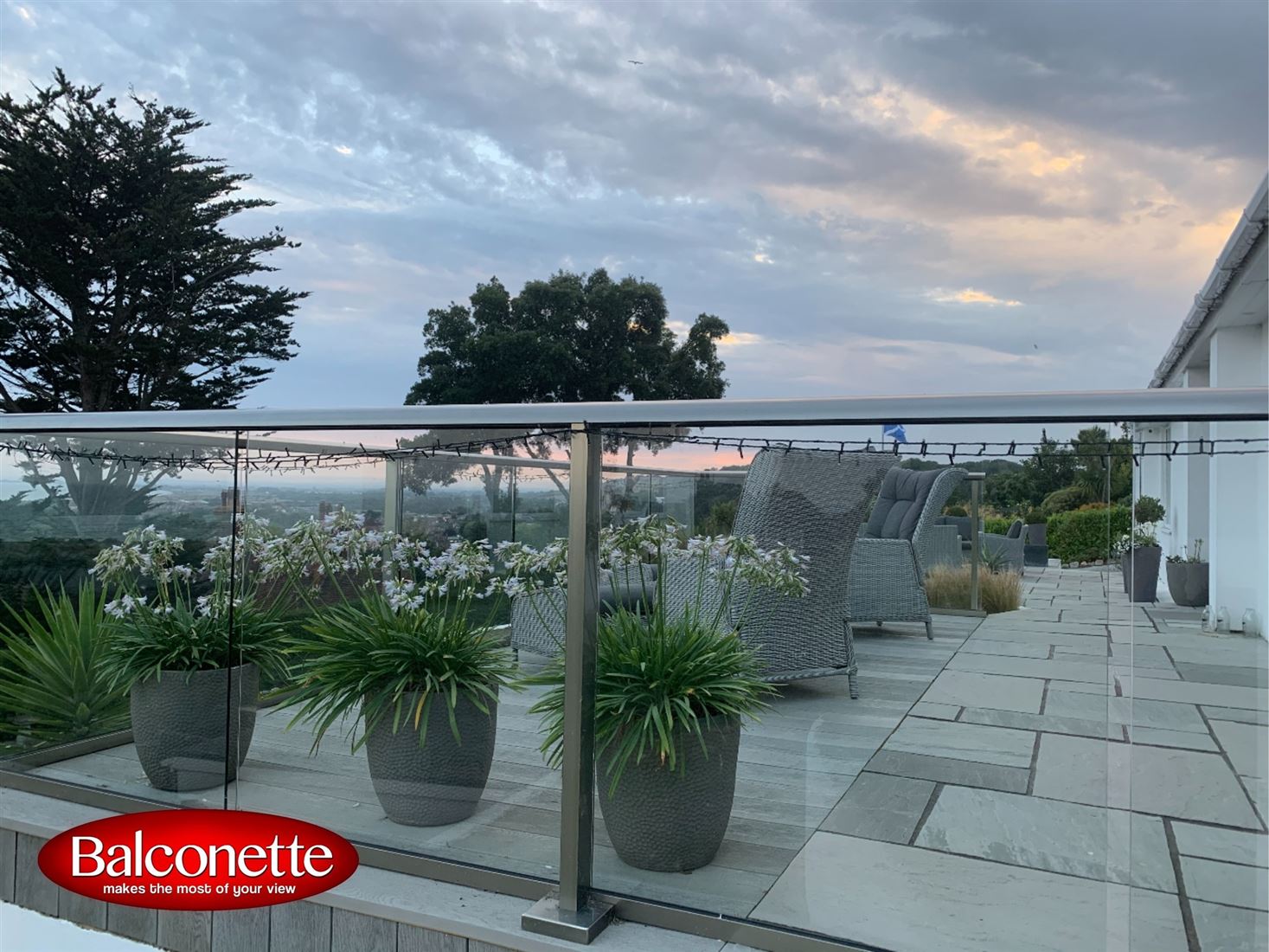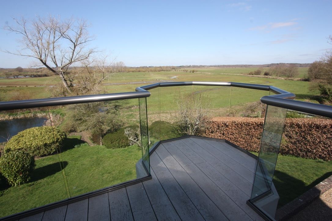 Curved balcony with Royal Chrome handrails overlooking the garden