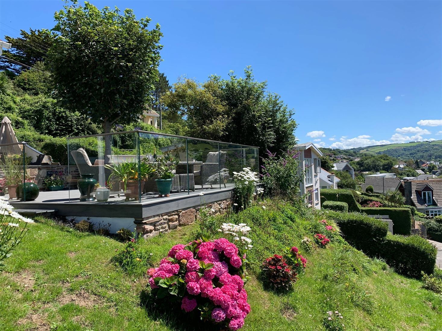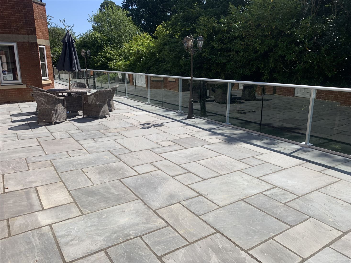 Long silver balustrading to a covered BBQ area surrounded by beautiful gardens