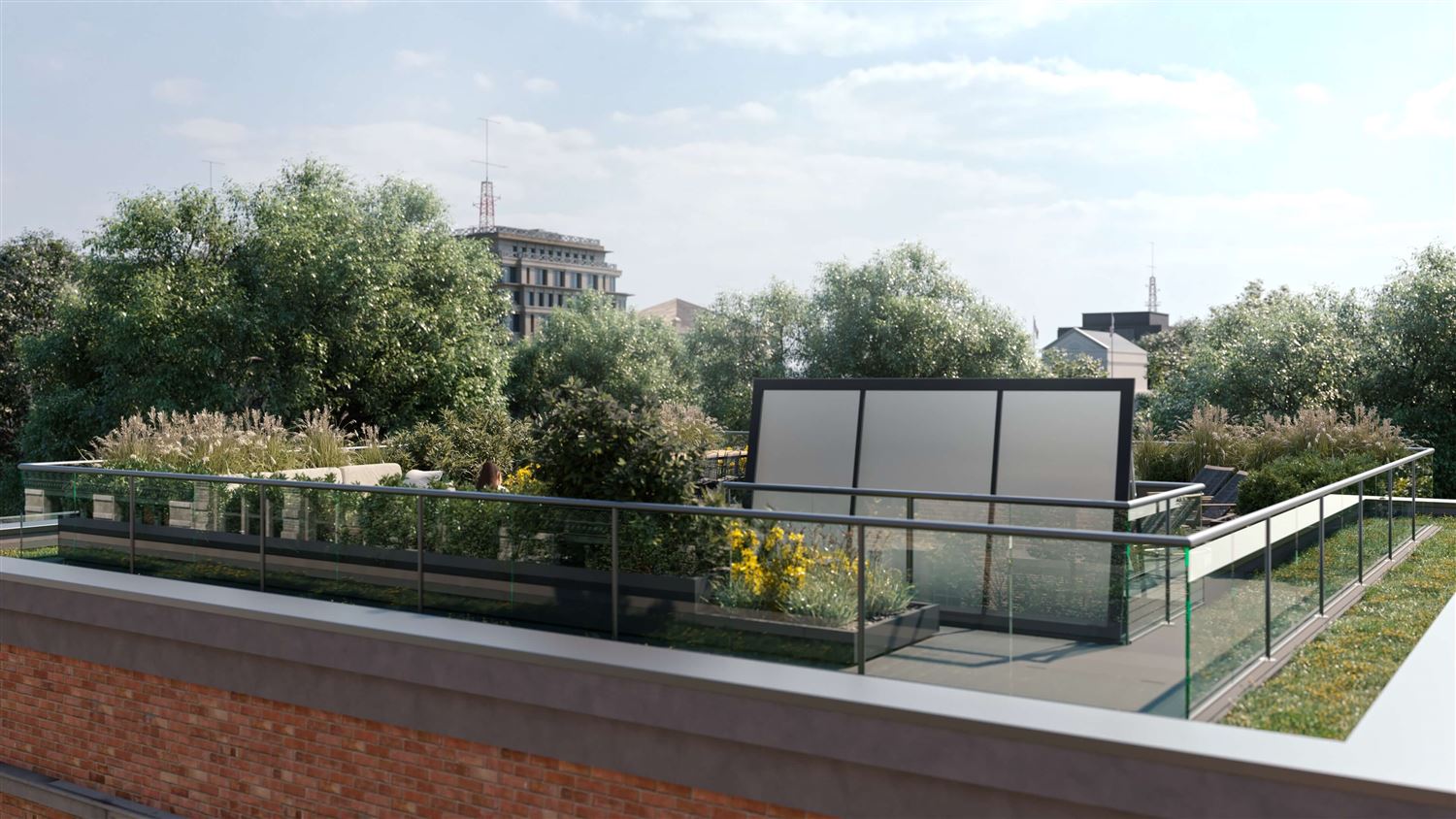 Bronze balcony 1 curved balustrade with detailed patio and garden with trees