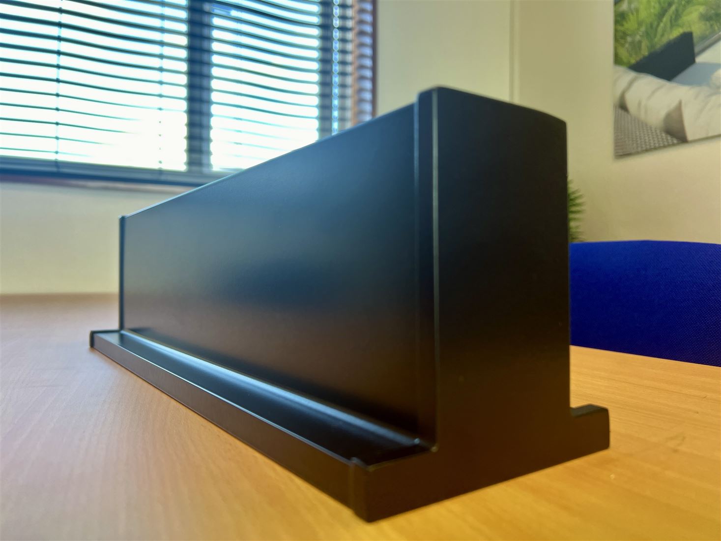 Side view of long restaurant balcony by the sea with silver handrails and posts