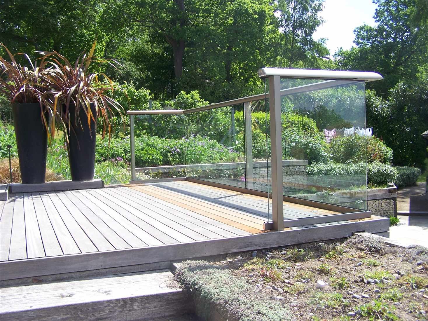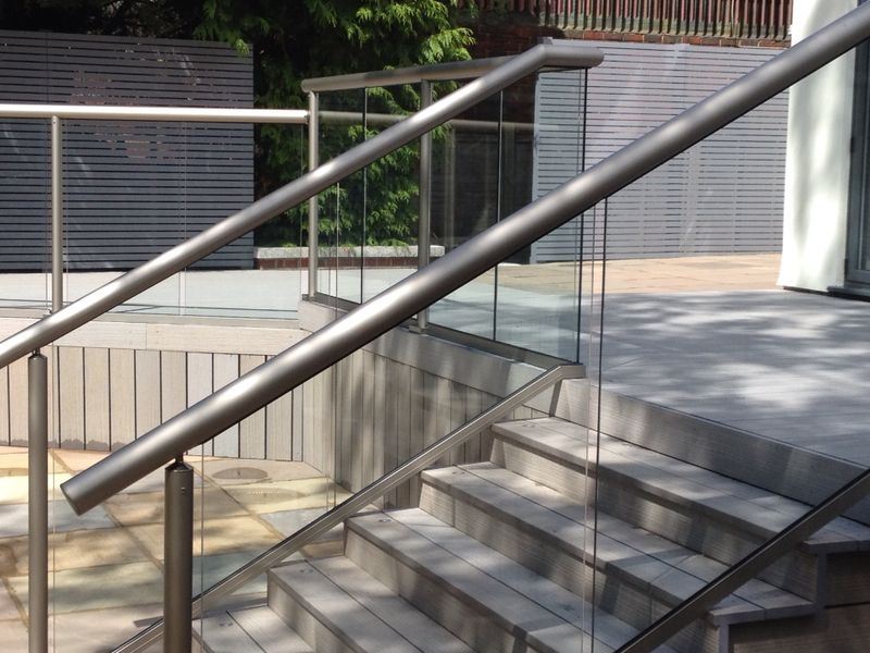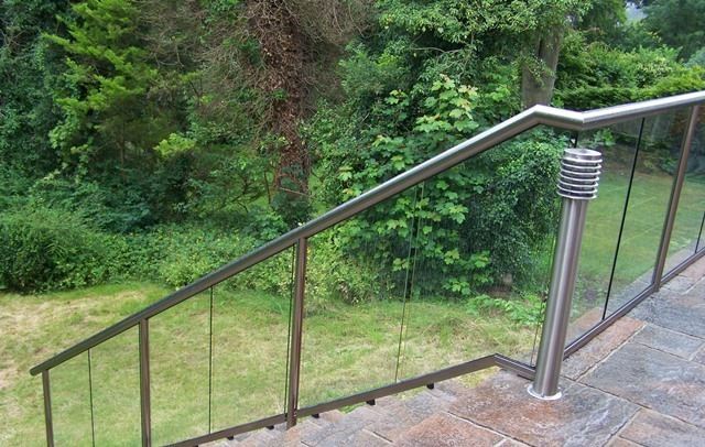 Wide balustrade with silver handrails and posts looking out to beautiful gardens