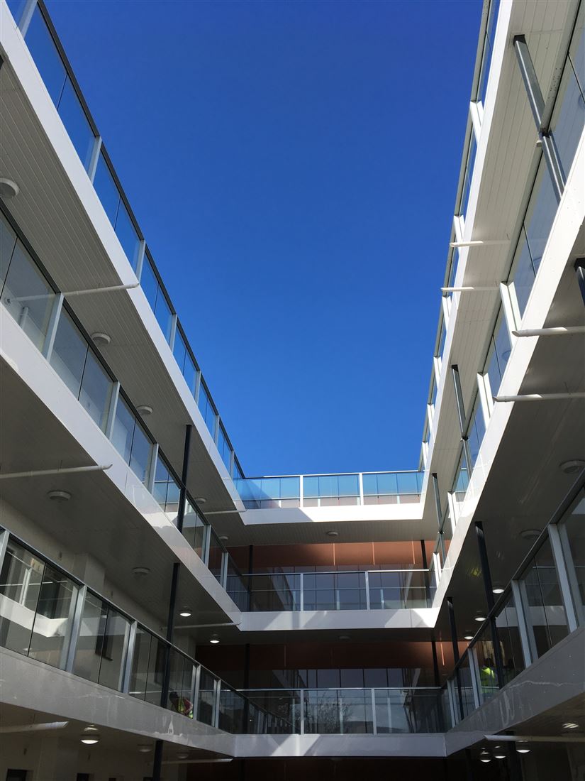 Looking up at balconies with Royal Chrome handrails and posts with blue skies