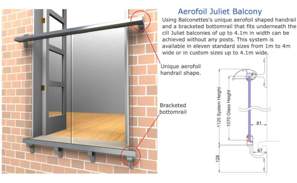 - The Aerofoil Juliet - This Juliet type uses a wing shaped (Aerofoil) handrail and a small bottom rail